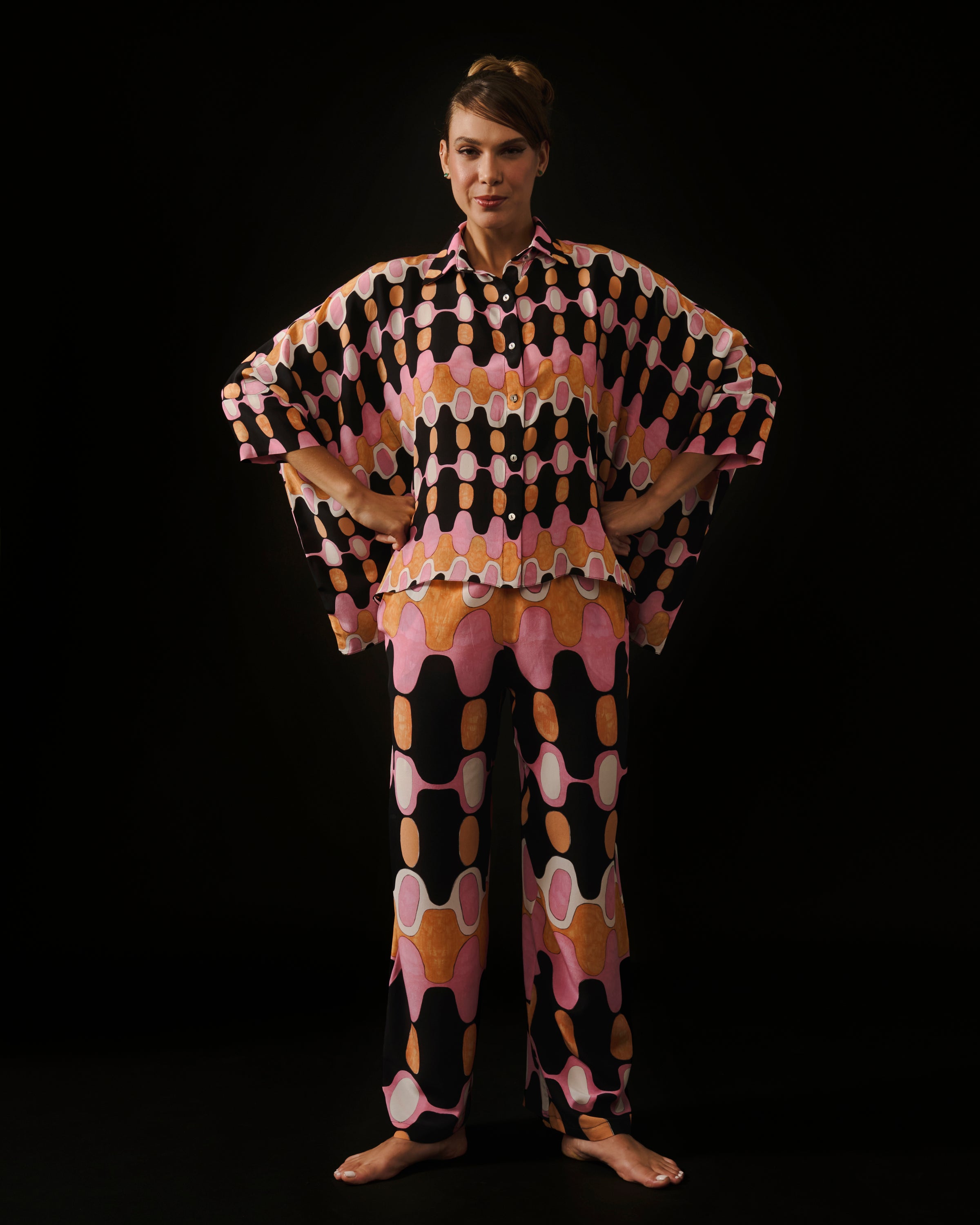 A Camisa Lenço possui formato retangular e modelagem larga, com caimento leve que remete à um lenço.