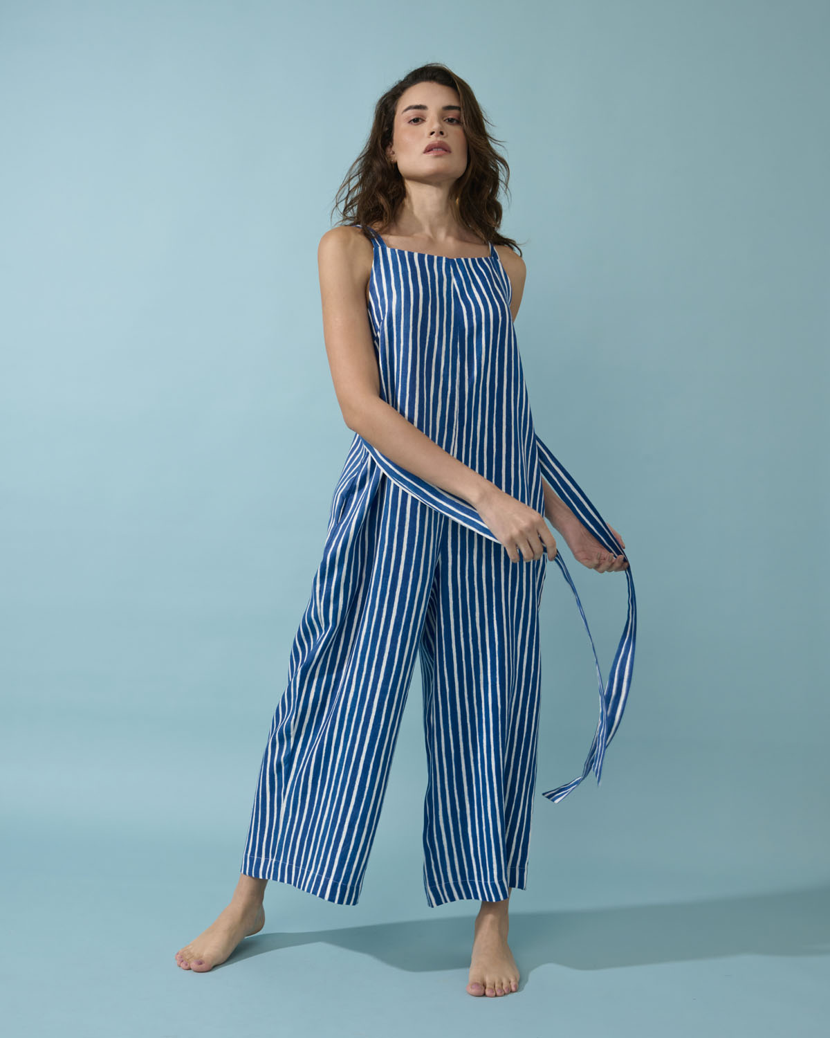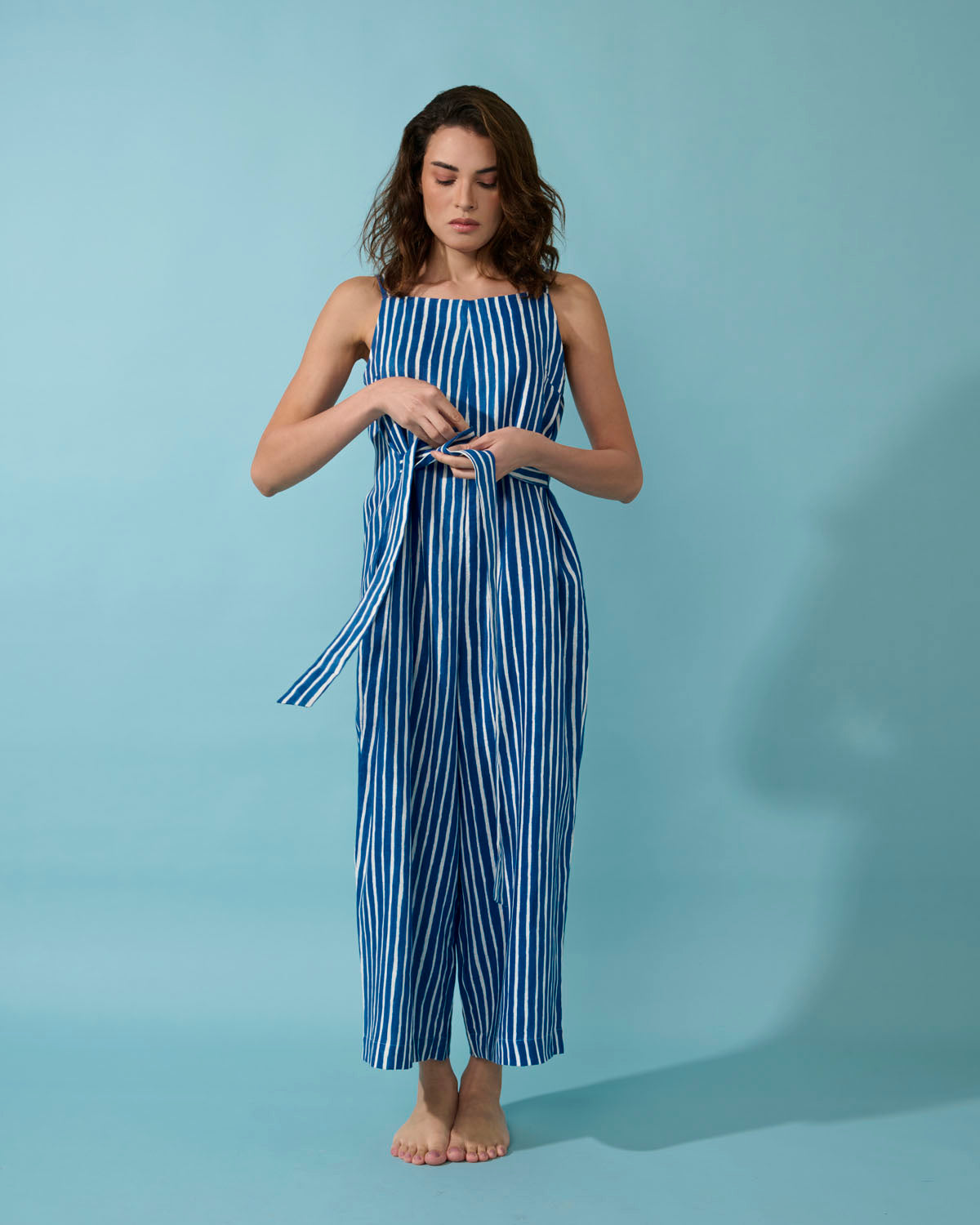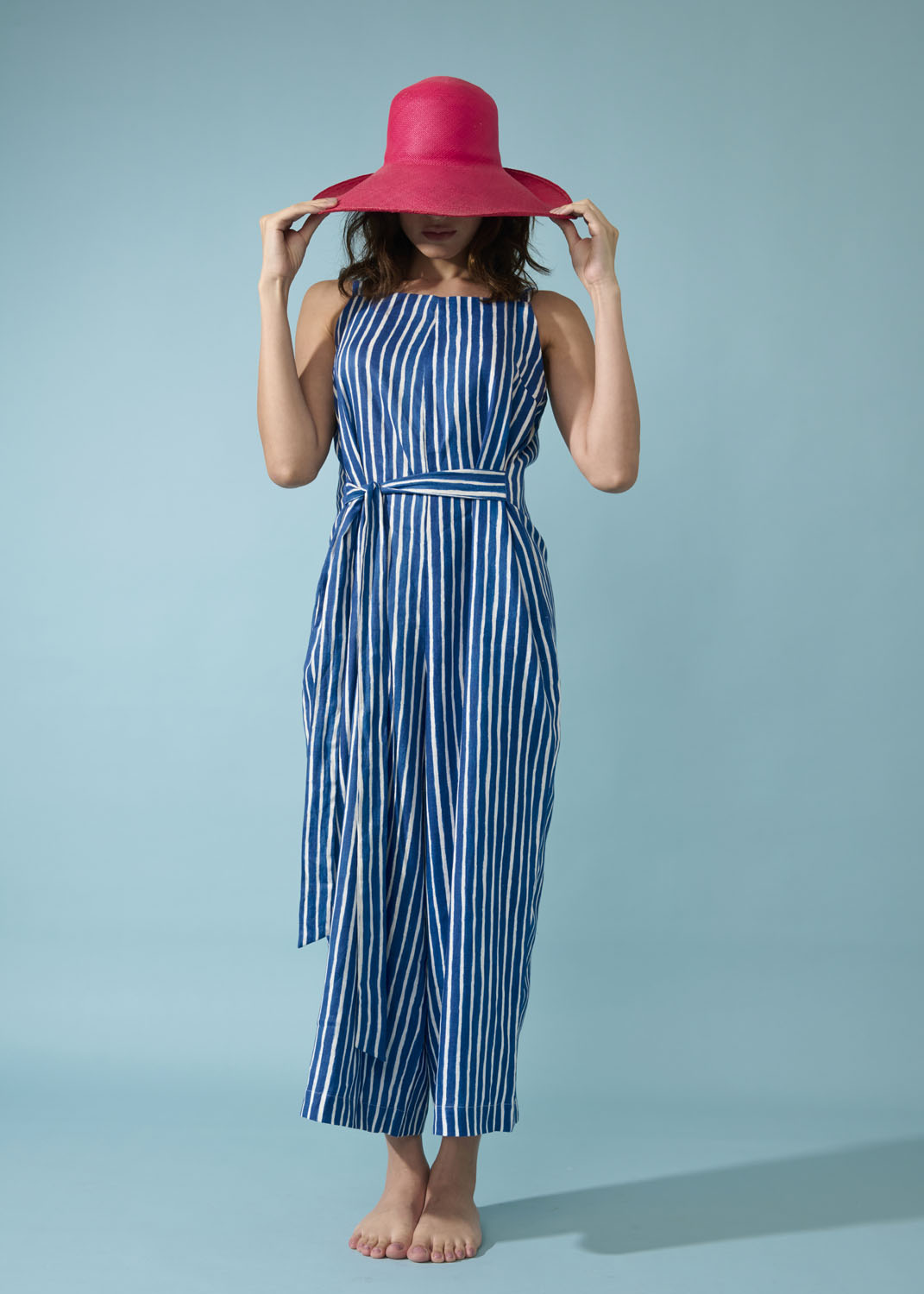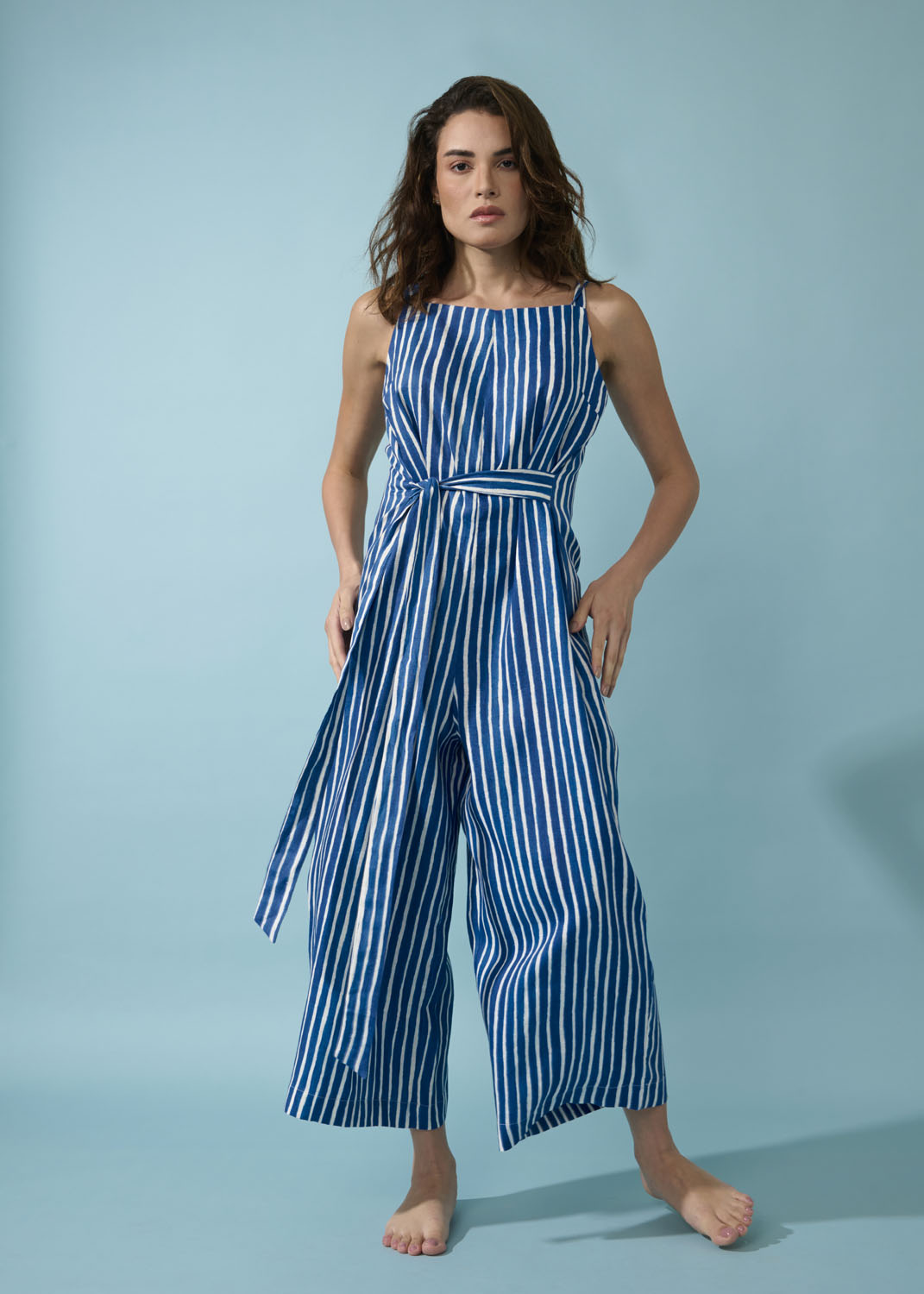 Macacão de decote reto, e alças, bem solto no corpo, podendo ser ajustado na cintura pelas faixas laterais.Possue bolsos. Uma peça confortável para o verão!