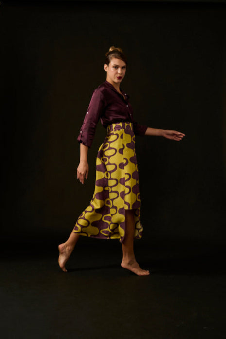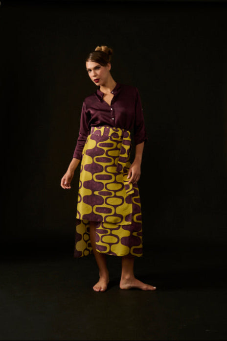 A saia degrau é tipo envelope ; tem transpasse , mas veio renovada com o detalhe de 2 alturas, uma pelo joelho, e a outra mais longa. Se adapta a qualquer tipo de corpo. A largura da saia permite um bom fechamento. Ótima para compor com a Camisa T .