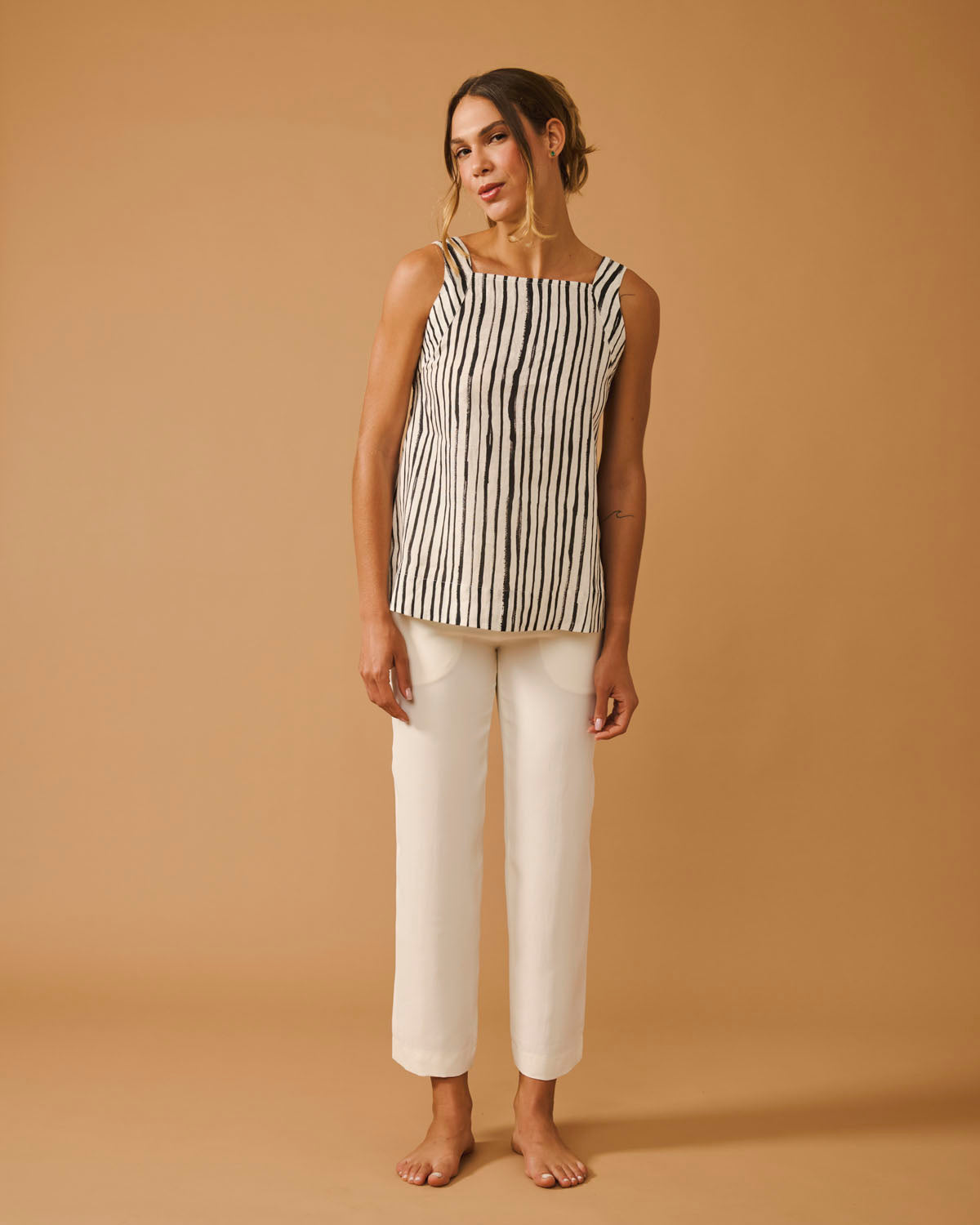 A blusa Diva é uma regata, com corte reto na frente, e caimento bem solto do corpo , com uma amarração nas costas.Feita em 100% linho. Perfeita para o verão!